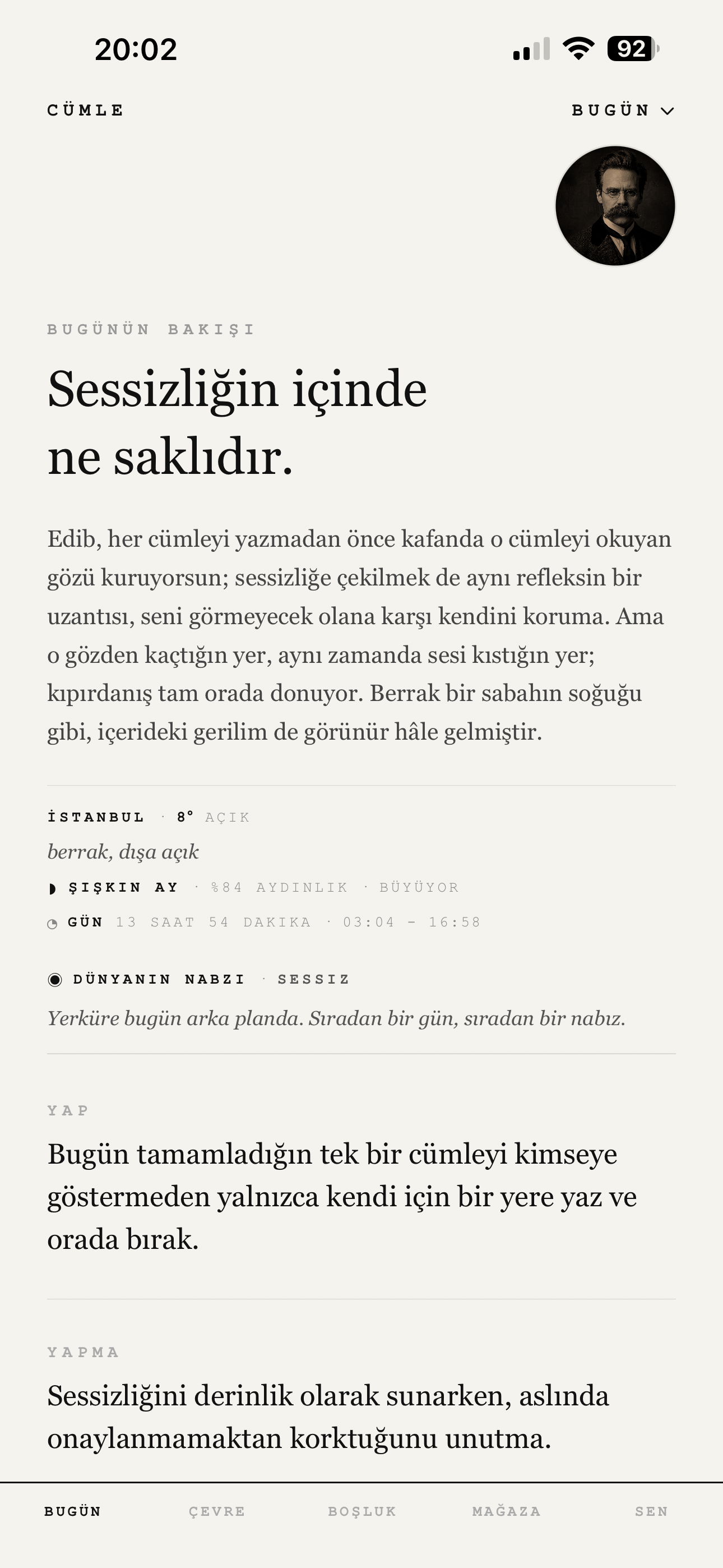 Uyandığında bir ekran dolusu bildirim değil, tek bir cümle bekler seni. Kafka'nın, Tanpınar'ın ya da Kierkegaard'ın sesinden, tam bugüne hazırlanmış. Zihinsel sessizlikten doğan, günün tonunu belirleyen bir söz.