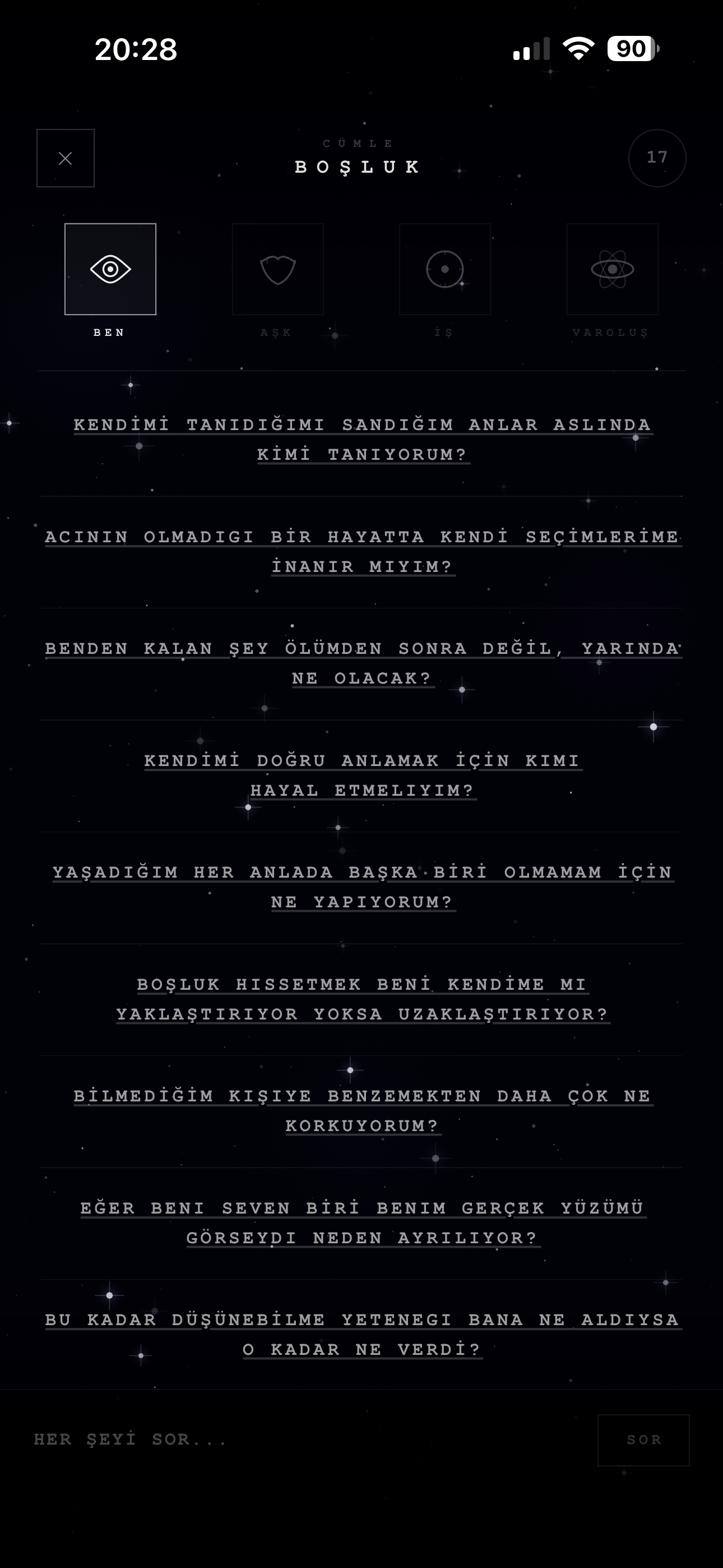 Aklına takılan bir şey var mı? Sor. Sorun buraya yazılır, cevap gelir, ardından iz bırakmadan silinir. Ne kaydedilir, ne paylaşılır, ne görüntülenir. Geçmişte tutulmaz, gelecekte aranmaz. Sadece sen ve o an. Samimiyet için saf bir alan.